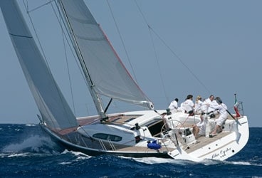 The Dehler 60 carries a three-spreader carbon mast with an extended masthead crane to accommodate the full-roach main, and an aluminum pocket boom. The backstay is split to allow access to the swim platform. The headsail is non-overlapping and has an electrically powered belowdecks furling system.