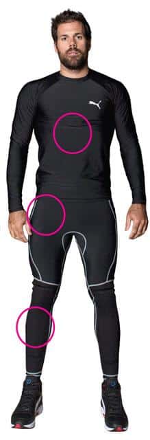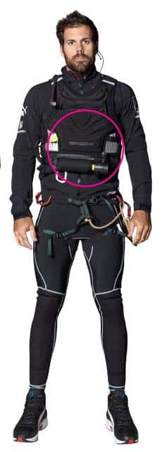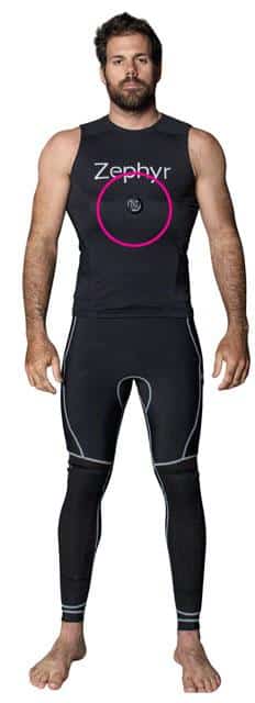 The sensor puck built into Zephyr’s Team BioHarness 3 Compression Shirt (at chest) records heart rate, breathing rate, and body temperature. The team’s performance coach downloads the data after sailing to track each sailor’s individual workloads and calorie consumption.