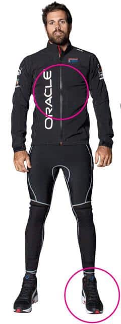 This lightweight, wicking thermal layer is worn on race days. Designed in conjunction with PUMA and Zhik, the base layer’s pants have shin guards. “Running into a loaded wing sheet as you’re crossing the tramp is like hitting rebar,” says Falcone. “It can really take you out.”