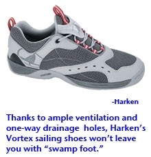 During a week of warm sailing at 2007 Acura Key West Race Week, the Harken Vortex Deck Shoe did everything that I expect of a sailing shoe. Break-in time was zero, as the shoes felt comfortable onthe first day out. The construction on the top of the shoe-large ventilation areas crisscrossed by support bands-is ideal for warm weather sailing. The support bands provide great lateral stability while retaining flexibility. The traction provided by the sole was average on what our crew collectively felt was a slippery deck. Harken’s integrated shoelace protectors worked very well; I tied the shoes once in the morning, and untied them at night.Best of all, after a week in saltwater with onlyone change of socks and no fresh water rinsing, the shoes still smelled like new. Attribute this to the silver integrated into the foot bed. Harken has also added drain holes that allow water to only drain out of the shoe. A few bathtub tests confirmed that, for the most part, the holes work as advertised.Despite all of the ventilation, the Vortex shoes could also be adapted for cool water sailing. The foot beds can beremoved to make room for dry suit booties.If you want a shoe that stays dry and doesn’t smell after a week of sailing, this shoe’s for you.For more, click here.