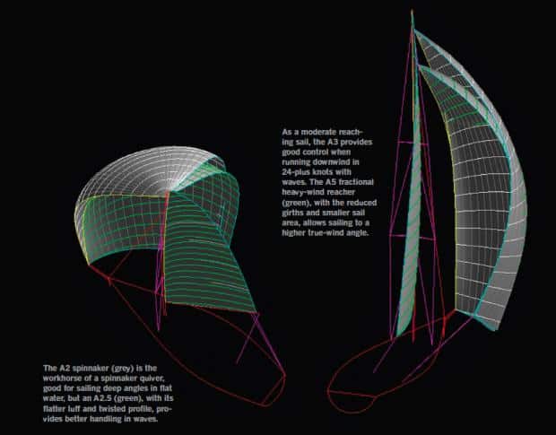 An A2 or A4 runner would have the same sail area as your biggest symmetric spinnaker, but provide a better option to bridge the gap between 130 degrees and 160 degrees true-wind angle. This would also provide better control running downwind in the 16- to 24-knot range with waves. Above this range you’re back to the A5, with the reduced girths and smaller sail area to allow you to sail a bit higher true-wind angle to maintain a user-friendly groove to drive the boat around in the waves.