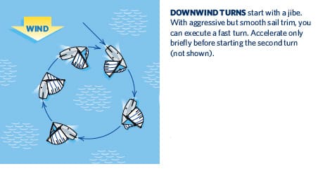 If you start your circles with a tack, your tack will be at full speed. Coming out of that tack, your boatspeed will be less than if you bore away, which means you won’t be sailing downwind as far before you jibe. For example, if you were in a Melges 32, sailing in 12 knots of wind, and simply bore away, you would be going downwind at 9 knots. But if you tacked first, then bore away, your speed downwind before the jibe would be 5 to 5.5 knots. Once you jibe, you can do a powerful turn up with speed, accelerate for 2 to 3 seconds, and then start your second circle with a tack (see the diagram above). It’s important to understand what the rules say about penalty turns. The turns must be started “promptly” in the same direction, but don’t necessarily need to be in a continuous motion. In other words, you don’t need to roll right into your second turn immediately after the first. I typically do one turn, accelerate briefly—one to two boatlengths, not 10—then start my second circle. This enables the boat to get back to speed before driving it through the next circle. A lot of this depends on wind velocity and the boat. In a dinghy, you can often spin within the length of the boat. Use your body weight to steer, coupled with rapid easing and trimming the sails.