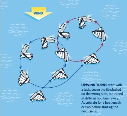 What I learned while sailing in college is that, if you’re going upwind, start your penalty circles by tacking first, and if you’re going downwind, start your penalty turns with a jibe. Years later, this rule of thumb is still the first thing to know about executing the fastest penalty turns. There are two reasons for doing so: 1. You accelerate out of a down-speed jibe more quickly than out of a down-speed tack. 2. You don’t sail any more distance away from the next mark than necessary. Different boats require certain mechanics to sail most efficiently through the turns, but the following guide should serve as a good starting point. Here’s how the basics of a faster penalty turn break down.