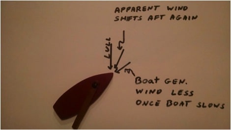 Extending that logic, in a lull, instead of bearing off or going straight, we could head up a little and burn off speed to VMG toward the mark, then bear off once down to the new speed. I don’t think that is practical. Instead, at the onset of a lull, I think it makes more sense to just be patient and steer a straight line.