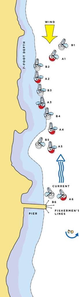 The diagram depicts an incident that is a fine example of the typical situation in which boats are involved with a continuing obstruction. Ann rounded the windward mark clear ahead of Bert. The next leg was a run in light air and strong adverse current. The boats were one-design keelboats that drew about 5 feet. The water depth gradually decreased as the boats neared shore. The bottom was sandy and there were no dangerous rocks. Each boat had a depth sounder that enabled the crew to know how much water was under the keel. The boats could safely sail in about 7 feet of water with little risk of running aground — provided their crews monitored the water depth. The 7-foot contour line is shown in the  diagram.