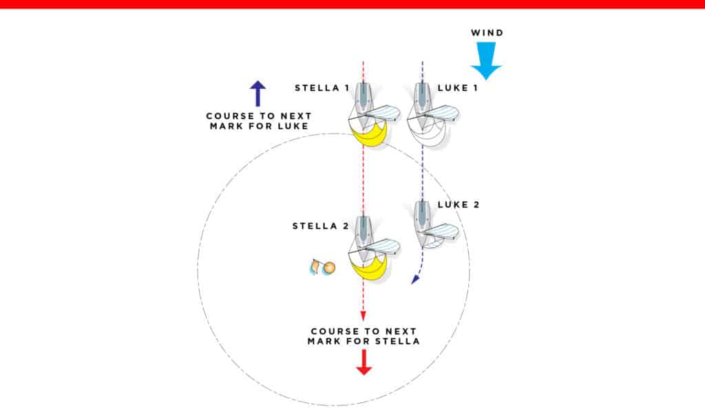 The rules require Stella to be disqualified for breaking Rule 11, but the real party at fault here is the race committee. By setting courses, which made Mark G1 a rounding mark for the slow boats and simultaneously a passing mark for the fast boats, the race committee created this awkward situation. Rule 18 is not designed to work when boats are required to round a mark in different ways. I have made this point before: ISAF Case 26 shows that it’s downright dangerous to require some boats to round a mark to port while others are rounding it to starboard, and US Appeal 97 shows that Rule 18 can be impossible to understand when a mark is simultaneously a windward mark for some boats and a leeward mark for others. The predicament for Stella and Luke illustrates that mark roundings become confusing when boats’ courses require them to exit the mark on different courses. The lesson here for the race committee is simple: Do not use one mark for two different courses if boats sailing each of those courses might be rounding or passing it at the same time.
