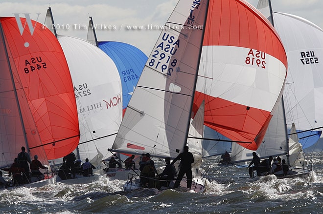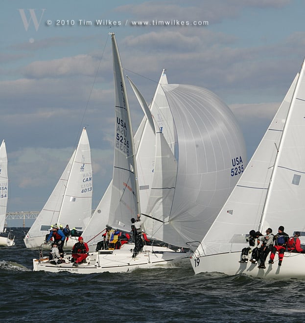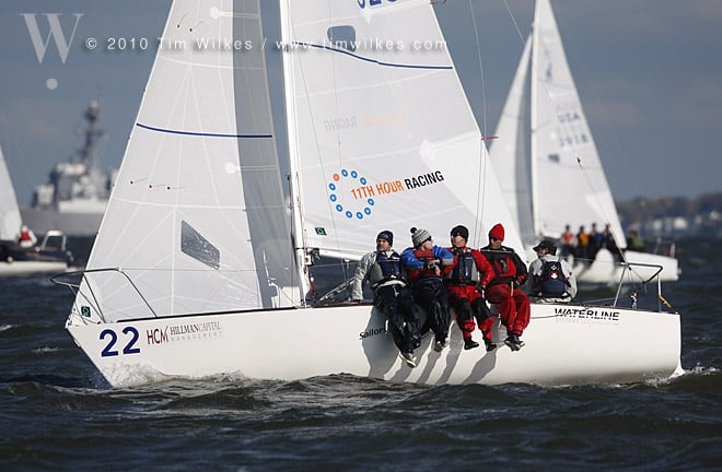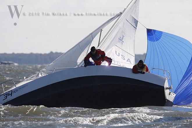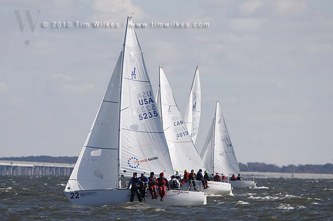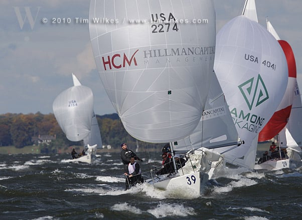 Mark Hillman, veteran J24 sailor from Annapolis who’s company Hillman Capital Management has sponsored the East Coasts for as long as I can remember, handles the big breeze and turbulent Chesapeake with control and poise.Tim Wilkes