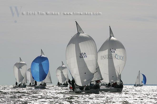 Tim Healy, East Coast and World Champion, is greeted by a wall of port layline boats while setting his kite.Tim Wilkes