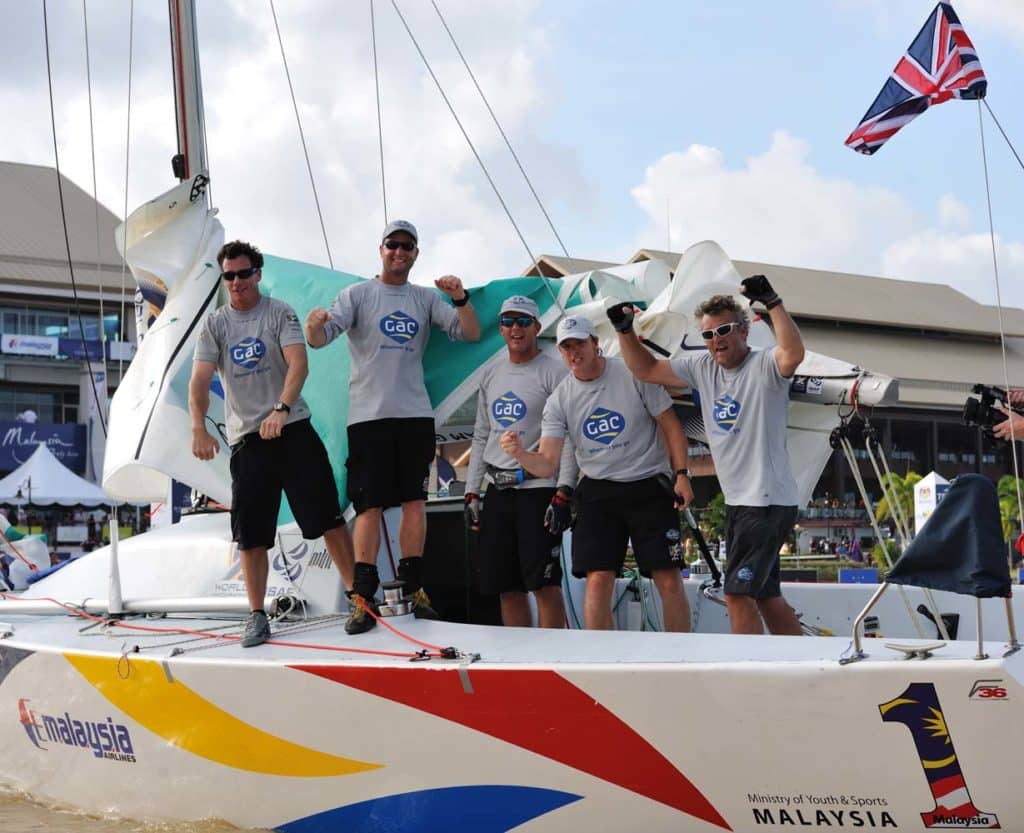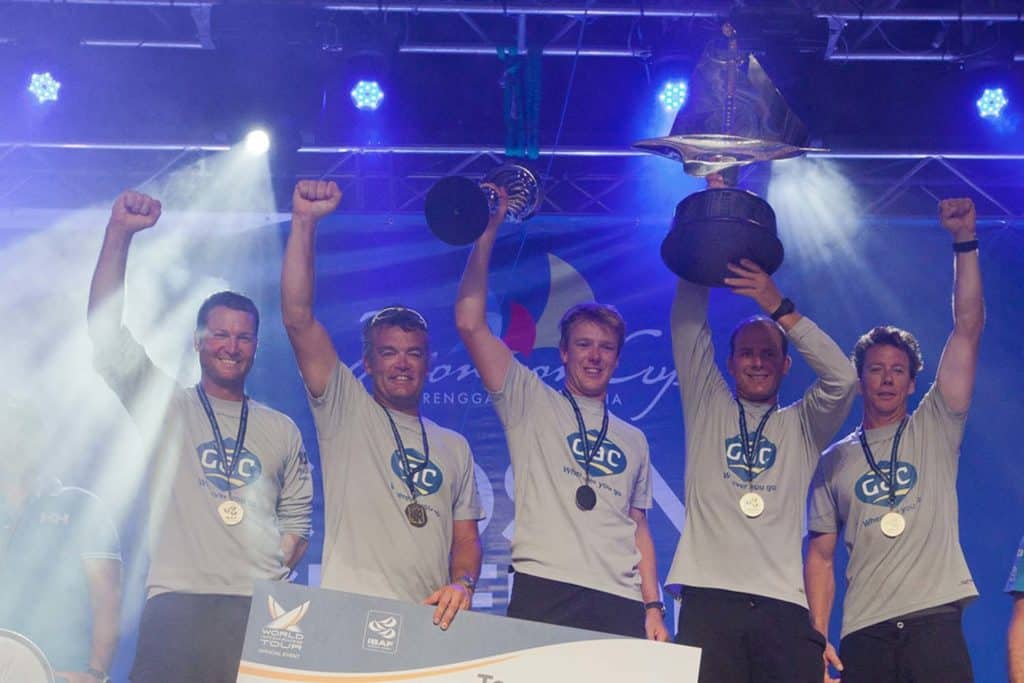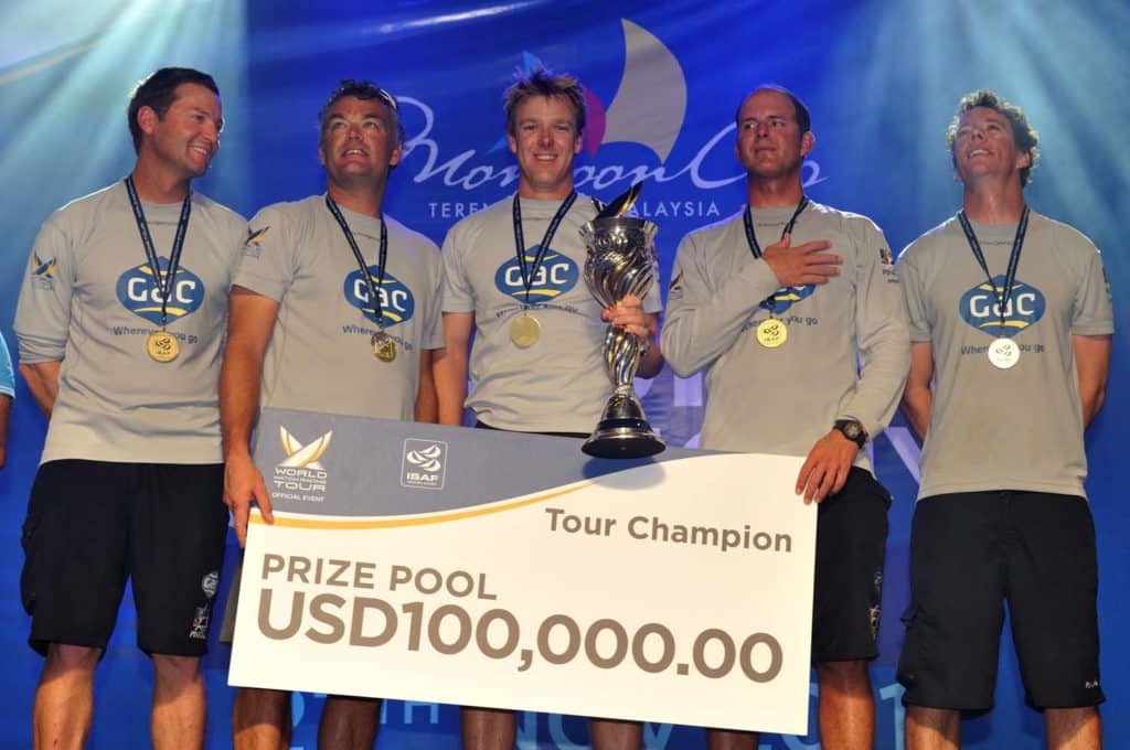 Ian Williams with both the Monsoon Cup and the World Match Racing Tour trophy at the Monsoon Cup 2011. Kuala Terengannu, Malaysia. 27 November 2011. Photo: Gareth Cooke/Subzero Images.Gareth Cooke