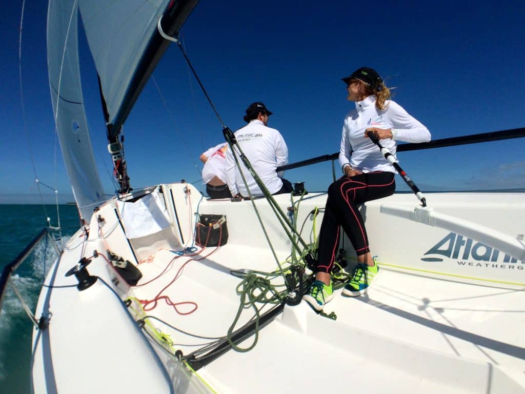 My skipper, Heather Gregg-Earl, likes the sensation she’s feeling on the helm as I squeeze the mainsheet another inch tighter. The leech loads up and the boat squirts forward with a half-knot boost.