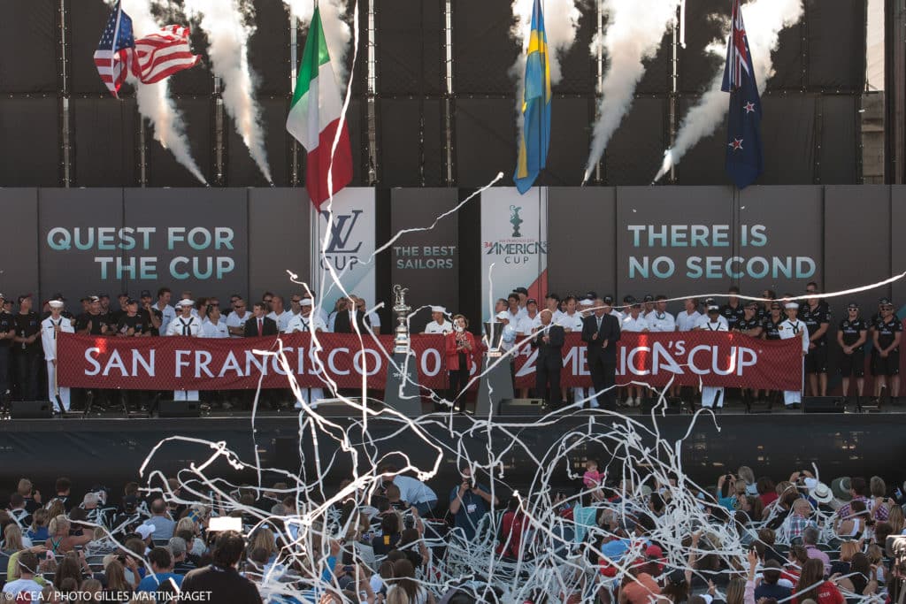 The Defenders put their ware on the pedestal. With a message from skipper Jimmy Spithill to his competitors: “Bring it on, brother.” ACEA/Gilles Martin-Raget
