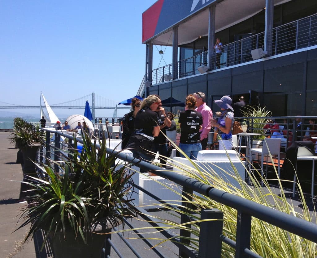 On the far end of the pier is public race viewing, in front of the exclusive, but well placed AC72 Club and Oracle hospitality center where VIPs get an early taste of the treatment. Dave Reed