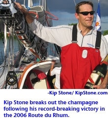 In mid-November, Kip Stone became the first American sailor to win his class in the Route du Rhum, a singlehanded race from St. Malo, France to Guadeloupe. In doing so, Stone broke the class record for the 3,500-mile course by over 18 hours, finishing in 17d:22h:36m. However, Stone says the race, his second solo competition across the Atlantic, didn’t feel much like a record-breaking run. He rarely, if ever, saw the expected trade winds and spent a lot of time bobbing around in little or no breeze. A sudden front on Day 10 shredded one of his headsails, but it was the constant pressure applied by the 25-year-old Frenchwoman Servane Escoffier that provided the most excitement. After building a big lead early in the race, Stone, 45, watched Escoffier chip away at his advantage until she was, at one point, theoretically in the lead. But Stone was able to prevail down the stretch. When we spoke with Stone a few days after his finish, he was already back at work at his screen-printing company Artforms, but dreaming of his next solo adventure.Congratulations on the win. Were you surprised at all by your performance?I was labeled the overwhelming favorite, so in some ways I had everything to lose and nothing to win. In the end, of course, to finish first, first you’ve got to finish. To go 3,500 miles and keep the thing together and push hard, it’s an accomplishment. I’m pleased and I’m happy it’s over; it was a long and hard race.For the 60-foot tris and the Open 60 monohulls, especially the leaders, it was a quick race. But that wasn’t the case for your class, was it?The times for the tris and the Open 60s were stunning. I think it’s fair to say that the further back you were in the race, the worse the winds were. I would characterize this last trip across the Atlantic as very soft. I spent days bobbing around, working hard to make the boat go 1, 2, 3 knots, and very little time at speed-15, 16, 17, 18 knots. On a trip of that length you’d expect more of that. You look at the 40s that finished behind me by days and days. It’s not representative of the relative speeds of the boats.That low speed stuff is sometimes more taxing than the gnarly conditions…For me it is. I like going fast. Sitting around, really just trying to keep the boat inching along, it’s so hard. The pilots don’t work, there’s almost more noise with the boat just rocking around in the middle of the ocean. After a time, it’s just maddening. I had a lot of that, a lot more than I would’ve ever expected. I didn’t see one hour of trade winds the whole trip. Imagine sailing from Europe to the Caribbean without the trade winds. That’s what that race was about.Enough to make people go crazy. But then most people think you’re already crazy.I’m just barely hanging on to my sanity.Being labeled the favorite. Is than an indication of how far you’ve come in this sport over the past few years?I certainly have put my time in the boat. I think I’m close to 50,000 miles now. I don’t know if the word made it out. Most of my time is spent in the office trying to earn money to keep the boat going. So when the last minute they told me I needed to do a 500-mile qualifier, I dropped my crew off in Halifax and sailed solo to the start of the race. I had three solo transatlantics in me before the start of the race. Like any boat, time in the boat is a huge advantage. On top of that I’ve got a very fast boat.You mention the boat. How close are you to maximizing the potential of Artforms?I think for myself personally, sort of the rule of thumb in Open-class sailing is that it’s 50 percent boat and 50 percent sailor. I’d say for me, I keep learning things, but my curve is flattening out. The boat, like any Open-class boat, you can keep throwing money at it and make is faster. I’m self-sponsored so there’s only so much of that I can do. It’s a miracle I’ve got as far as I’ve gotten. There’s room for improvement for sure. Another couple of percent, easy.After this win, your third big win, are you starting to get any interest from sponsors?I’d love to hear from anybody who’s remotely interested in sponsoring this effort. I feel like I’ve learned how to play the game. I’m ready to take the next step up into the 60s. Artforms is for sale. I’m trying to find the person for whom this boat becomes the next opportunity.It seems like the 50-foot class provides a great learning platform.I think so. Certainly for me that’s been my experience. It’s a mini 60. It’s a little bit more forgiving and it’s a lot less expensive but it still lets you get out there and put the pedal down and have the experience of sailing the boat fast offshore.It’s a packed schedule for solo sailors over the next few years. What are your plans?Right now, I’m back in my office, trying to build my business to a level where I could consider campaigning a bigger boat. But it’s a big jump from an Open 50 to an Open 60. In the meantime I’m hopeful that I can find some people or corporations that want to help me shortcut the process. For me, it’s starting to feel like the end of my first ride on this boat. Now of course, if nobody steps up and goes after the records I’ve set, the Bermuda One-Two is coming up again. The Transat Jacques Vabre is just around the corner. Transat is only 18 months away. Those are all super great races. If things were to work out, are you looking at the Barcelona World Race, or the Vendee Globe?I dream about doing those races. But it’s still a jump for me. To get from a 50 to a 60 is a big jump financially. I’ve got a team in place that’s ready to go. I feel like I’ve learned to play the game. I’m gung-ho, so it’s really just a matter of trying to figure out how to make it happen.Take us back to the race you just finished. You got out to an early lead, but it got quite close at the end. What happened?Servane Escoffier, she was doing everything right. I had a nice so