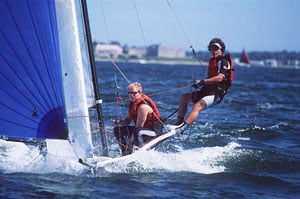 We were becoming very familiar with the boat, and though our boathandling still left something to be desired, it was markedly better than when we started in May. Since we no longer had to worry about capsizing every two seconds, we began to focus more on rig tune and sail shape. Vanguard provided the class with a tuning guide, but there were few bonafide go-fast tips for the new boat. The best way to know if an adjustment worked was to experiment.