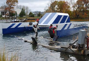 But the Big Kahuna, of course, is Big Blue, a 40-foot cat that can accommodate four rowers in each hull. The boat looks like one of my son’s Lego projects, but we’re about to find out if it’s fast, too.