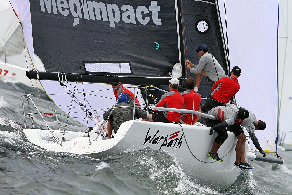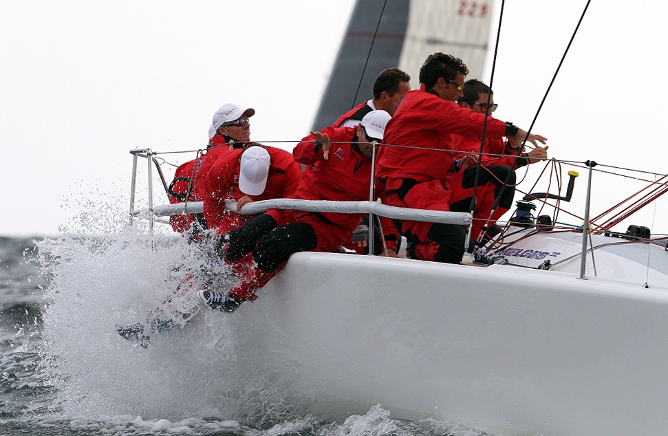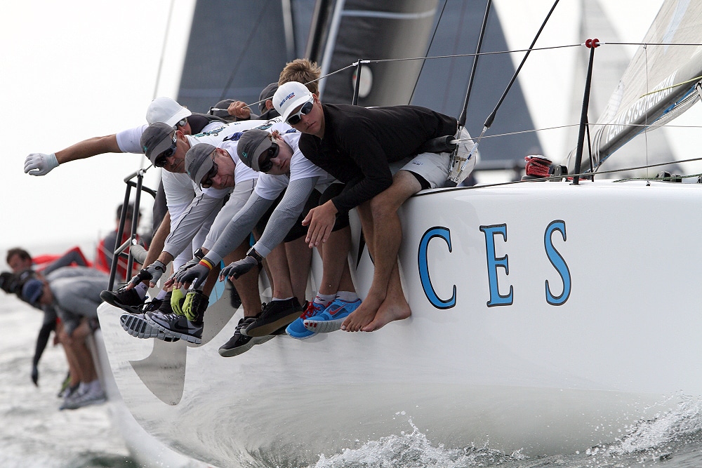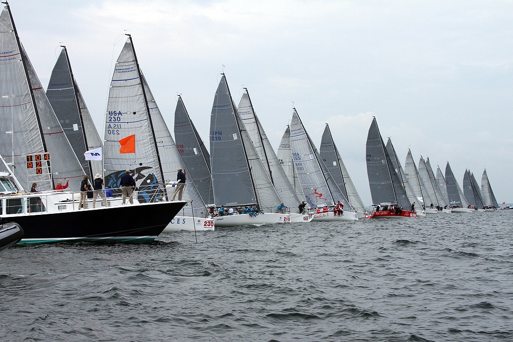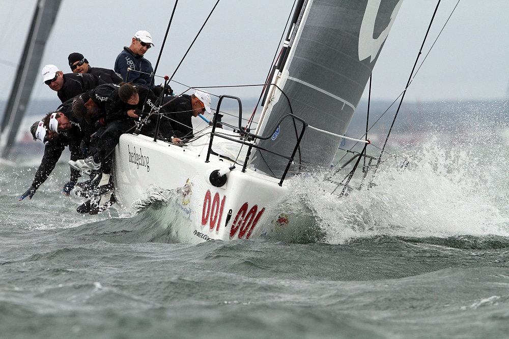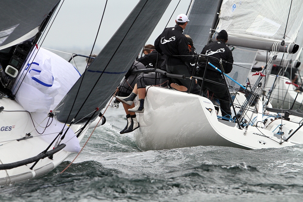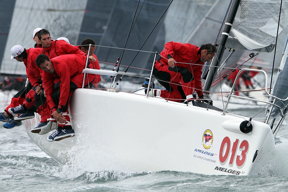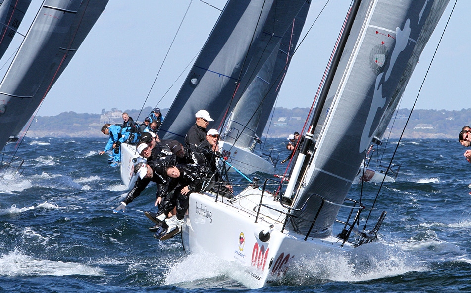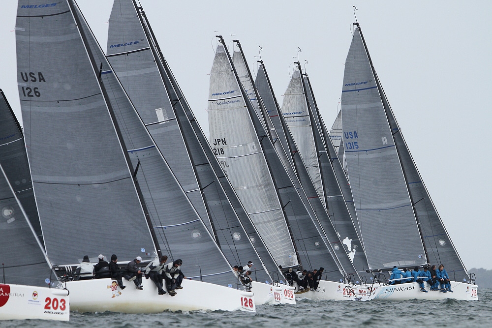 A record-breaking 33 Melges 32s representing eight countries race out of Newport, R.I., for the world championship through Sept. 29. Big breeze is forecasted, and a collision has already forced the retirement of one team. Photos: ©2012 JOY | International Melges 32 Class Association