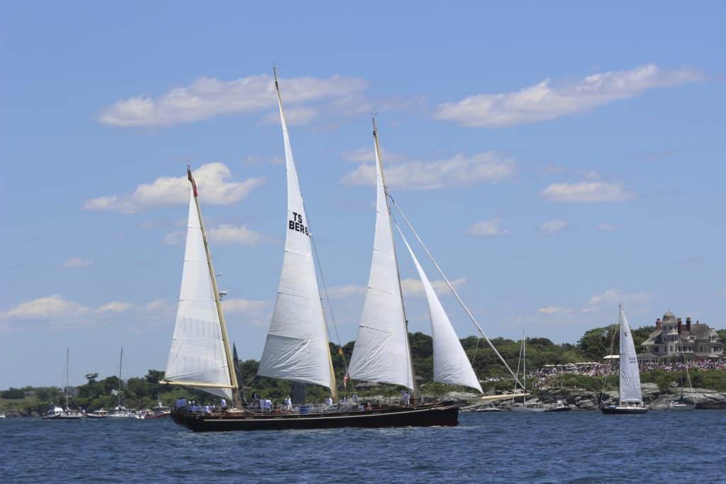 Spirit of Bermuda, a replica of a British Royal Navy sloop-of-war, is racing in her own class as a part of this year’s Newport Bermuda Race. Here she is off of Castle Hill Inn, to the delight of the crowd of spectators ashore.
