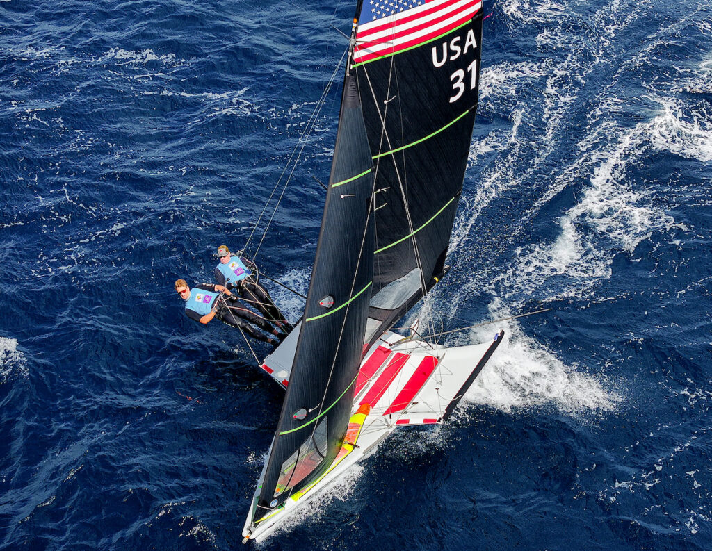 The strategy paid off for Snow and MacDiarmid, who did find themselves on the podium, taking 2nd out of 101 boats after narrowly beating the Chinese by a single point in the regatta’s exciting finale race. The result made them the second U.S. pair to medal in a 49er at Palma in the 28 years the event has hosted the class, following in the path of Hans Henken and Ian Barrows, who won silver in 2022. Only 9 Americans have been recorded on the podium in the 55-year history of the race, including Noah Lyons, who also brought home a silver medal this year in the Men’s IQFOIL fleet.