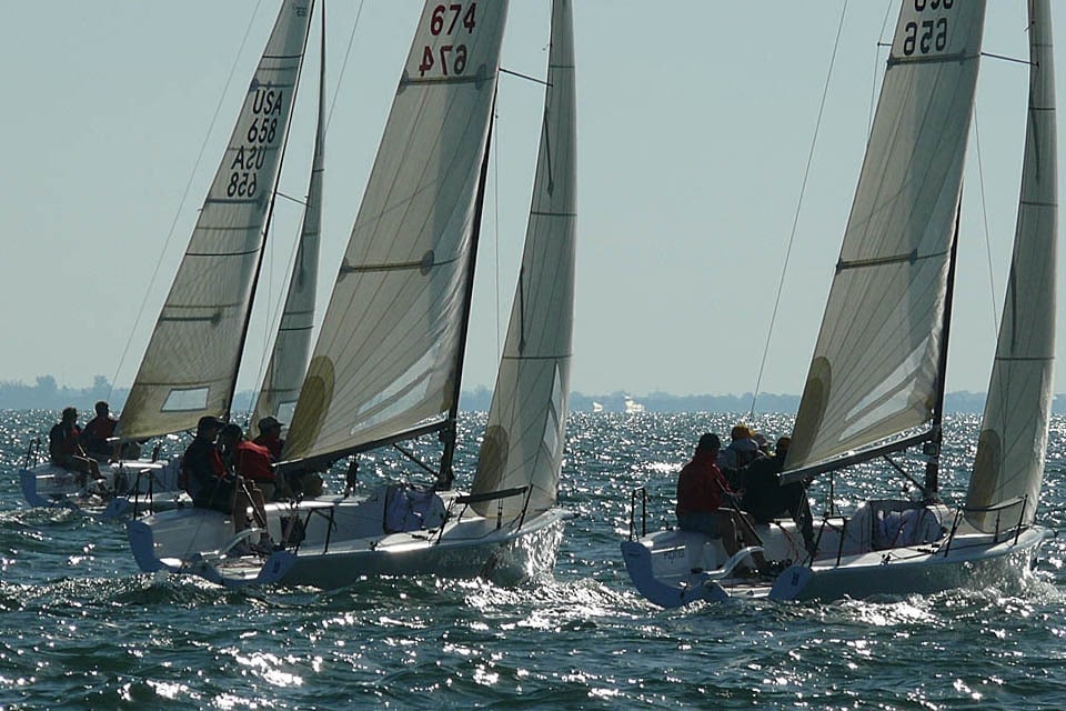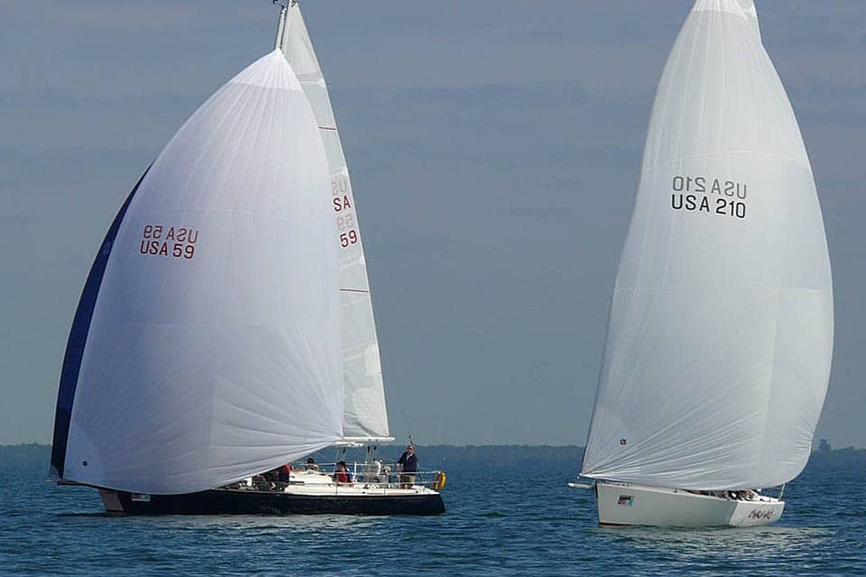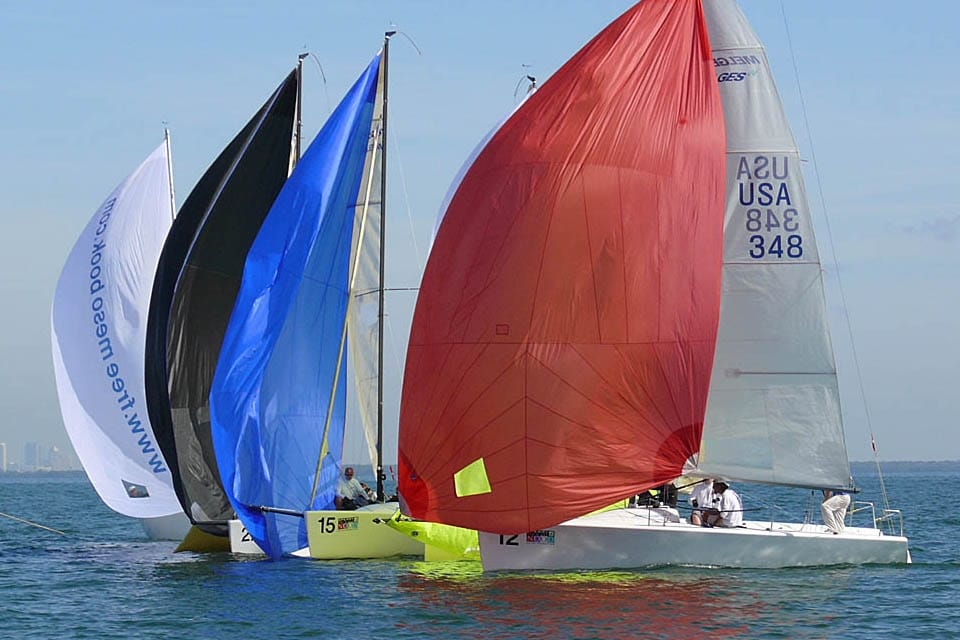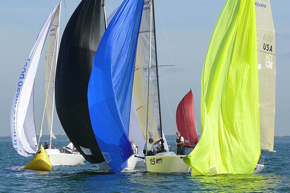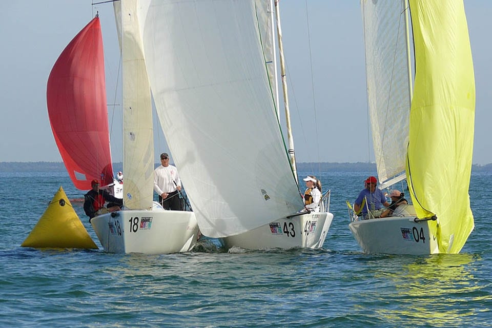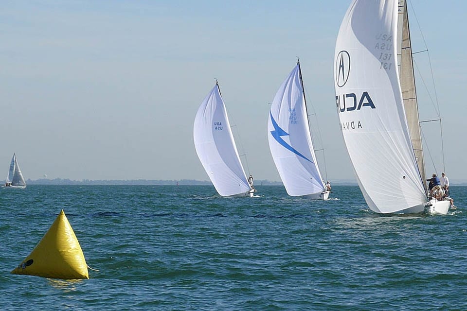 Steve Olinger’s J’Makin’ Waves tries the low road while Kevin Grainger’s Gumption 3 defends its wind against another boat hoping to make a last-second pass.