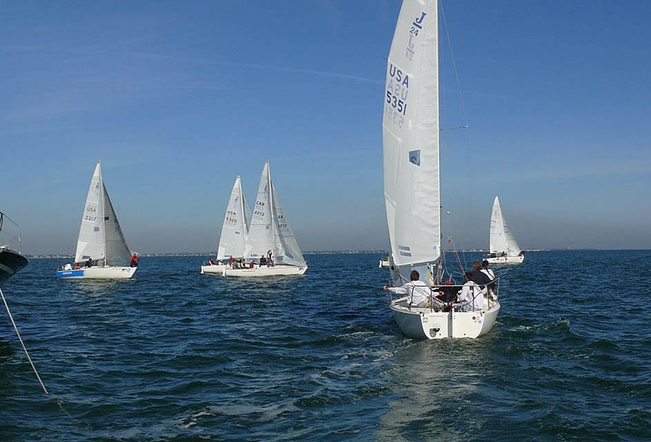 Chip Till and his crew on Tunnel of Love, one of 25 J/24s sailing in the 2008 Sperry Top-Sider St. Pete NOOD Regatta, goes for an unconventional approach to the starting line, coming from windward of the committee boat with 30 seconds until the gun.
