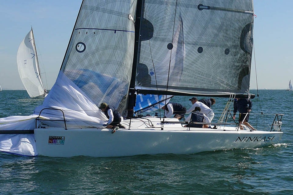 The crew of John Taylor’s Melges 32 Ninkasi scrambles through a complicated windward douse and jibe during Race 1.