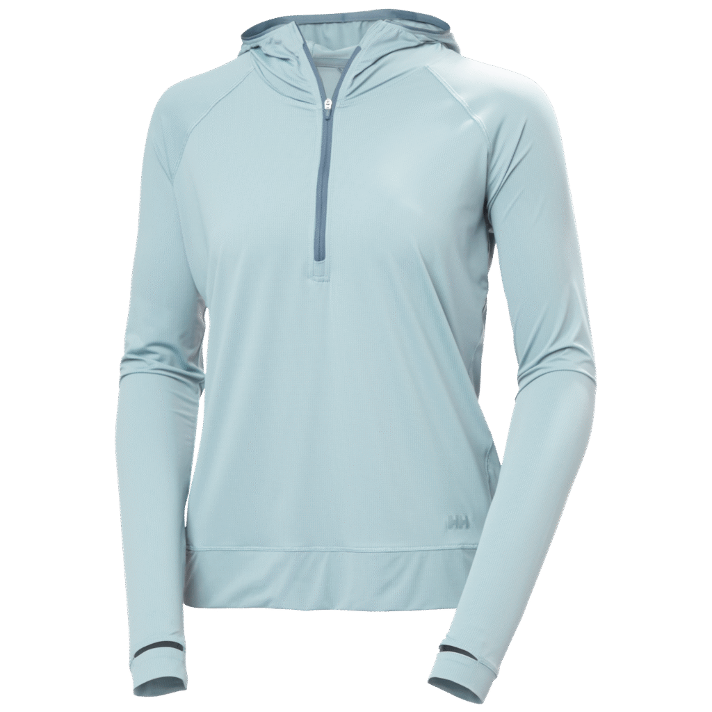 With UPF 50 protection, the elasticized hood on the Solen fits snugly around the face for maximum coverage, and thumb holes in the sleeves keep the cuff over the back of the hands—a common area for sun damage Courtesy Helly Hansen