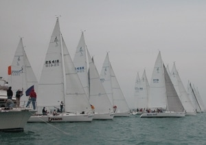 The Tartan 42 Great Whisper began Day 1 of the 2003 Sailing World Detroit NOOD regatta in fine fashion, blaring “Eye of the Tiger,” by the 80s band Survivor from their deck speakers on their way past the Bayview YC and out to the racecourse this morning. It might have been the retro tunes, but could just have easily been the pent-up anticipation of the crews of the 188-boat strong fleet that finally convinced the breeze to come up after close to three hours of postponement. Classes A and B each got off two races in breeze that never went over ten knots, while the smaller boats in Class C had to content themselves with one.