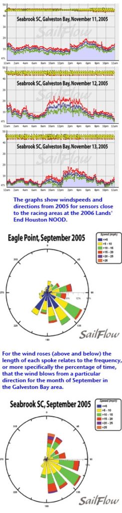 While other parts of the country transition into fall with an increased number of stronger frontal systems, Texas generally remains shielded from the fronts by the placement of the jet stream. Occasionally, usually towards the end of September, a cold front will stir southwest flow through the region.The frequency of tropical systems typically declines through September (although last year Hurricane Rita forced the postponement of the Houston NOOD). So far this season the Gulf has been fairly quiet in terms of tropical activity, but pay careful attention this week, as tropical waves and energy can significantly alter wind patterns. Sea breezes often develop along the immediate coast in the afternoon hours, complicating wind patterns for sailors. With Galveston Bay water temperature remaining in the 80s and inland temperatures pushing well into the 90s, the resulting thermal gradient along the coast can locally enhance wind strength and direction, occasionally veering winds as much as 90 degrees. The strength and direction of a sea breeze wind is tied to a number of factors, including the strength of the coastal temperature gradient, orientation of the coastline, cloud cover, and prevailing synoptic winds, therefore, anticipating the sea breeze pattern can be very tricky for sailors near shore. The accompanying wind roses give a taste of September winds for two sites within Galveston Bay. Seabrook Sailing Club is a Sailflow weather station and Eagle Point is run by NOAA. Both locations show an overwhelming tendency to east and southeast flow. This tends to be the dominant direction for September, reflecting strong sea breezes.Also included here are the exact wind graphs for Galveston Bay during last year’s regatta, which took place November 11-13. The first day of the event, the winds started easterly and veered to southeasterly, with and mid to late afternoon peak. This is the signature of a typical sea breeze, with gradual veering throughout the day. The second and third days of the event were highlighted by a frontal boundary setting up inland, thus afternoon sea breezes coupled with the prevailing SSE flow to create much stronger winds. These fronts are more common during late fall, when last year’s regatta took place, and it’s no surprise that winds were so strong. With this year’s regatta taking place in September, sailors may not experience such strong winds.