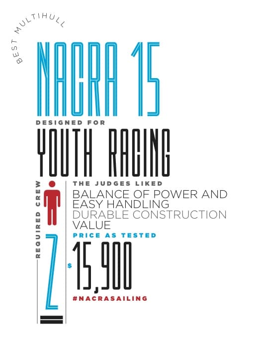 Unfortunately, the judges never got a chance to experience the enlightened state of fast youth beach-cat sailing, nor the 15’s toned-down traits. On a sub-10-knot test-sail session, they barely touched the trap wires, but still got a feel for the boat.