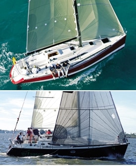 Some people make no distinction between cruiser/racer and racer/cruiser. It’s a matter of semantics to them. A dual-purpose boat is a dual-purpose boat. But we’ve always found that some such boats do have a dominant race personality and some have a more cruising nature. When we saw the C&C 115, we were confident it would live up to its racer/cruiser label and the Jeanneau Sun Fast 35, likewise, a cruiser/racer. But while reviewing the boats, we decided to dig into the details of each and see if we could confirm our first impressions. Racer/Cruiser, the C&C 115 Consider the basic specifications of the new C&C 115. The hull is made of E-glass and epoxy with CoreCell core, and reinforced with carbon fiber in high-load, high-stress areas. The vinylester and e-glass deck is cored with Baltek AL 600, and the mast is a 59’9″ carbon fiber, two-spreader design that carries a near-masthead kite and a 110-percent genoa and weighs one-half of what a comparable metal rig would. The rudder is a high-aspect ratio blade, and a lead bulb sits at the bottom of a deep keel. The transom is open and the deck layout is race-ready. While the boat comes standard with discontinuous rod rigging, jacketed PBO standing rigging is available as an option, which adds surprisingly little to the all-up price. Ten years ago, you would have paid top dollar for such a boat, you’d have had to wait six months for a custom builder to build it, you wouldn’t have been able to afford the carbon rig and you couldn’t even buy the PBO shrouds. Lucky for us, C&C is offering the 115 as a production racer/cruiser that anyone with the cash can step up and buy. It’s clear that Tim Jackett, designer and COO of builder Fairport Yachts, has spent a lot of time on raceboats observing how crews get around a racecourse. The result is a well laid-out boat that’s in line with racing ergonomics. Let’s start with the 115’s toerails, which end just aft of the shrouds, look like they actually deflect water, and seem like they’d be great toeholds during breezy takedowns. Best of all, they won’t dig into the underside of your thighs when you’re hiking. Two Lewmar hatches also grace the bow, the forward most and largest (24″ x 24″) is sized perfectly for spinnaker douses. The side decks are roomy, a result of the 11’11” beam and the fact that the chainplates and jib tracks are tucked in close to the deckhouse. The cockpit is large enough for evolutions such as spinnaker jibes with a full crew. The main trimmer and driver positions are as well placed as anything you’ll see on a custom offshore racer. The C&C 115’s halyards, spinnaker pole controls, and reefing lines all lead from double-stacked organizers at the mast back to Spinlock jammers arranged on either side of the companionway. The companionway is snug enough to keep you safe when big seas are running and large enough to fit a pitman and his octopus act. The Harken winches also seemed to be placed perfectly for every maneuver that you’d see on a racecourse. We sailed the 115 on an atypical Annapolis day; it was blowing 16- to 22-knots, and there was a decent-sized chop on the brown waters of the Chesapeake thanks to some heavy rains the week before. Backing out from a tight raft-up on the Eastport side of the Severn we had an early indication of how well the 115 backs down and how maneuverable the boat is under power, even in awkward situations. We set a full main and a heavy No. 1, both built by Doyle, and started reaching past the Spider buoy to get a clear runway for some upwind sailing. The 37-foot 115 handled extremely well in the big puffs that might’ve spun out many other boats. The rudder is balanced, and while it kept us from cavitating, and allowed us to turn down even without mainsheet ease, we heard some groans and felt some stiffness from bearings that felt as if they weren’t up to the task. Jackett explained the problems: This was the prototype 115 and a custom stainless steel sleeve that was supposed to fit over the carbon rudderpost came from the manufacturer looking more oval than round, plus the bearings they’d used are slated for an upgrade in the production series. Despite these issues, once we were able to get in a groove, the boat steered like a dream with only slight corrections by the helmsman. We averaged between 7.5 to 8 knots upwind, depending upon the wind strength. Once the symmetric spinnaker went up, we started to fly. We saw speeds of up to 10.2 knots and never felt on the edge. In fact, when we had to steer deep to settle a wrap, it was easy to sail max deep and not feel as if we were going to clean everyone out with an accidental jibe. There were only three of us aboard for the test sail, but Jackett thinks a crew of eight will be the call for race days. The 115 we sailed is Hull No. 1, a prototype of the production model, especially as far as the interior is concerned. The interior was part mock-up, made of like-sized C&C interiors, so it was hard to get a feel for how roomy the interior is going to be. We’re told that the 115’s interior is based on what owners of the C&C 110, a seven-year-old model, and the three-year-old C&C 99 told C&C they wanted in future designs. Suggestions included a larger galley, a nav station that faces forward, and an aft berth placed across the boat rather than fore-and-aft. We saw 110-volt electrical sockets everywhere, grab handles, and a high level of fit and finish, especially for a prototype. The price of a C&C 115 ready to sail, with $35, 435 worth of race options, such as Raymarine ST60 instruments, a Horizon VHF with a remote access microphone/speaker in the cockpit, PBO shrouds, carbon spinnaker pole, two Harken winches for spinnaker handling, and high-tech race sails, is $204, 935. We feel that the 115 will be a player on any racecourse and with all these goodies, deserves the label racer/cruiser. But when you see a 115 this summer or at a boat show this fall, you may d