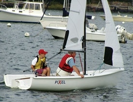 Bruce Kirby is at it again. The 76-year-old former Olympic sailor, International 14 champ, and raceboat designer has always had a thing about light and sound designs, notably his international success stories, the Laser and the Sonar. Now comes the Pixel, named for one of those dots of color on your computer screen. Kirby says the 13’8″ doublehander is his 15th dinghy design. The Pixel is a light, stable transition dinghy for youth sailors learning about jibs and symmetric spinnakers when they graduate from Optimists or other beginning boats. It also aims to be a boat on the recreational track, for kids not so fired up about racing or sailing solo. Kirby’s target crewweight is 200 to 250 pounds, so it should fit for kids who aren’t ready for more powered-up dinghies like the Laser and Club 420. I went for a sail with Lightning champ Jim Crane on one of four fiberglass and epoxy prototypes built in China for Nearwater Boats (Kirby and partner Wes Oliver). Considering that the wind was light, maybe 4 to 8 knots, and that we were 100 pounds over the target weight, we had a fun sail. The helm balanced easily, and the boat accelerated well in puffs, moving nicely through the chop. The bottom is flat so a little heel going over a bigger wave didn’t seem like a bad idea. The side decks were wide enough for comfortable hiking, and at its windiest, maybe 9 knots, we both were on the rail. I imagine two lighter youth sailors would’ve been sitting together on the rail in 6 or 7 knots of breeze, hiking comfortably in 8 to 12, and getting a good workout when the wind is over that. We set the spinnaker-the first time Kirby had had one up-and had some pleasant little scoots on a few small waves. I think the Pixel would plane easily with a modest amount of wind. It did for Crane’s brother Bill, who sailed the boat without the spinnaker in 20-plus and found that it planed upwind. Even without a trapeze, the boat has enough horsepower. Sailing in light winds as heavy adults, we could’ve used more sail area, but that means it’s probably about right for lighter sailors. Besides being relatively quick, there are other attributes worth noting: The double bottom and the shape of the side tanks makes lounging on the floor of the boat as comfortable as on the side, which for rec sailing is a plus. In combination with an open transom, these design features should make the Pixel easy to self rescue after a capsize. Even better, the boat is extremely stable to start with and has several good anti-turtling details including a sealed (carbon) mast, foam in the top of the mainsail, and inboard cutouts in the sidetanks to make it less stable upside down. I have to confess, due to the raw weather for our test sail, we saved the capsize test for another day. One smart feature of the Pixel related to its stability is its open bow, which makes it easy to step aboard from the float. While rigging the topping lift, Jim Crane stood in front of the mast and had no concern that the boat would flip the way many dinghies would. The absence of a foredeck kept his center of gravity low, and the light carbon spar couldn’t have hurt. Other factors contributing to stability are the flat bottom, relatively hard chines, beamy waterlines, and wide transom. In keeping with this, we noticed that a hard hike was needed to effectively roll tack the boat. The original idea of the Pixel came from Kirby’s partner, Oliver, who says the time has come for a new, modern dinghy that can teach all the basics of spinnaker sailing to lightweight sailors. He also thinks there may be a larger market for the boat, but his focus at the moment is entirely on sailing programs with transitioning sailors. Oliver wants to keep the price at $6,000 or less, and hence the construction in China. At press time in December, a fifth prototype was underway with a few modifications, such as two foam stringers to minimize flexing in the bow sections, and carbon spars (the Pixel’s first spars were built in New England). Oliver intends to deliver complete glass/epoxy boats, direct from the builder, including sails by Neil Pryde of Hong Kong. Production boats should be available for spring delivery. Pixel LOA 13′ 9″ LWL 12′ 6″ Beam 5′ 6″ Disp. 185 lbs. (hull) 220 lbs. (all-up) Sail area 94 sq ft. (upwind) Price $5,950 Nearwater Boats, LLC 203-855-8923