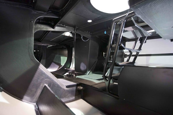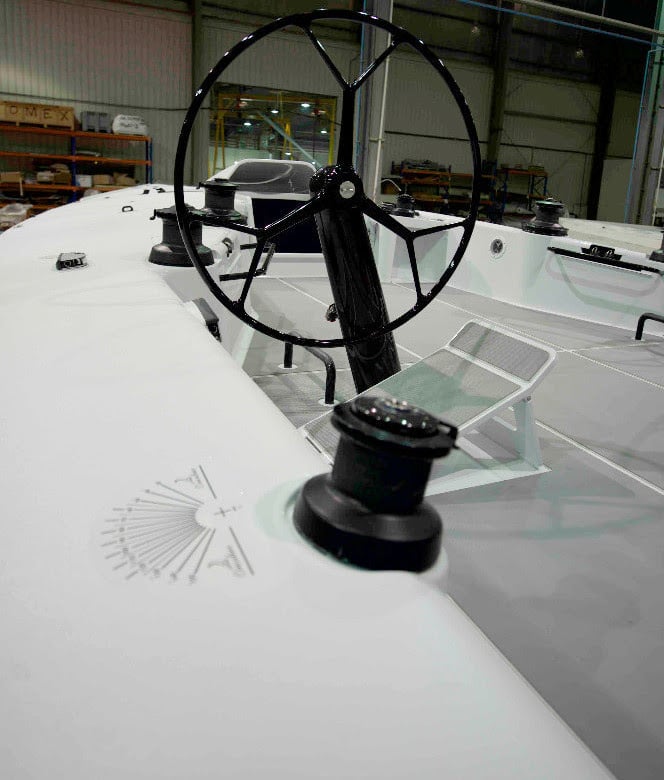 The hull & deck are constructed of carbon infused epoxy laminate & core cell foam under vacuum and cured in an oven. The Mills 45 also features additional optimised carbon infused reinforcements around all deck fittings and other highly loaded areas. Internally, the hull and deck liners are also lightweight, infused carbon/epoxy over foam core with uni-directional fibre reinforcement and a gelcoat finish. The yacht also incorporates a retracting propulsion system. Tight weight controls and measurements are maintained throughout the build process, to ensure that the boat achieves its target displacement weight of 5,500kgs.