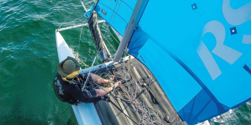 The traveler can essentially be left alone, Allen says, because fun is apparent-wind sailing. With the Cat 14XL, you’ll be sailing higher angles, so you can set and forget it — most of the time. Judge Tom Rich learned this on his first go. Downwind, in strong breeze, if you ease the main too far, bad things happen. Things like pitch-poles. “If you ease the main too much downwind, it pressures the top of the sail and encourages a pitch-pole,” Riccardi says.