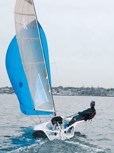 Last summer, Paul Cronin, a naval architect from Jamestown, R.I., architect from Jamestown, R.I., teased our curiosity when we casually asked him what he’d been up to lately. “I’m working on a project that will revolutionize sailing,” he said with an ear-to-ear grin. We pressed for more, but Cronin was tight-lipped, adding that he would tell us more when his pet project was ready for prime time. “Trust me,”he added, “it’s very, very cool.” Three months later, before the East Coast’s fall boatshow circuit, Cronin rolled out to the public what he’d been tinkering with for the previous 18 months. Enter the Bongo, an ultralight 15-foot “sportboat for one.” Think combination Laser and Melges 24-two benchmark boats blended into one. He was right. It is very cool. After several knee surgeries, Cronin was finding it too painful to crouch in the shallow cockpit of his Laser on light-air days. When asked, his doctor laid out two options for him-replace his knees or hang up his Laser sail. The latter was obviously the more appealing choice, so he started designing a high-performance boat he could singlehand comfortably. “What Idid was come up with a boat that Iwould love to sail myself,”says Cronin, “and then from there, Ide-tuned it a bit to appeal to a broader audience.”The influence of Cronin’s International 14 sailing is obvious in the boat’s chined hull, high-aspect foils, and tapered carbon rig; and his Laser experience is evident in the simplicity of the systems. The boat, which is built for Cronin by Abbott Boats in Ontario, Canada, weighs only 350 pounds all up (that’s 30 pounds less than a Snipe), and the sail inventory includes a 112-sq. ft. full-batten North Sails Kevlar main and 147-sq. ft. Airex asymmetric spinnaker. Below the waterline is a 3’11” lifting carbon-reinforced keel with a 100-pound lead bulb. Beam at the waterline is 3′, but the wing tip-to-wing tip spread is 6’6″. We took a near-final prototype for a spin on a 5- to 8-knot day in November in Newport, and had a blast, hiking off the wings as the boat sailed effortlessly upwind and down. That was the easy part. The hard part was kicking our displacement-sailing habits and remembering to keep the bow down upwind and to sail higher angles downwind. With so little hull in the water, the boat moved lightly as the leeward chine grabbed hold and kept the boat tracking. Even though you’re sailing what feels like a 15-foot dinghy, you’re still dragging around a lump of lead, so the Bongo’s keelboat attributes are obvious. Upwind, the acceleration is gradual, and to keep pace you really have to pay attention to sail trim. But the stability from the keel is definitely there, and once you get things balanced, the boat practically sails itself-you could drop the tiller, lean in to tie your shoe, and never stray off course. Downwind, the Bongo’s performance is what you’d expect from a mini sportboat-cleat the main, trim the chute, slide aft, tuck your foot under the footstrap, lean back, and enjoy the ride. It’s that simple. The rig is ultra-sensitive to mainsheet trim, and the vang, led to cam cleats near the mainsheet block, is there to depower the rig, too. For gross depowering through the upper wind range, however, there’s a 2-to-1 one-line reefing system. Two reef points reduce the working mainsail area from 112 sq. ft. to 90, and then to 75 sq. ft. (roughly the sail area of a Laser). Cronin, an athletic 185-pounder, says he drops to the first reef in 20 knots. This is done by dropping the halyard to a preset mark and setting the reef line. To shake the reef, do the opposite. The spinnaker launch system is equally simple; a continuous halyard led to a cam cleat on the starboard side of the hardware console simultaneously extracts the 3’6″ sprit and hoists the kite. To douse, release the starboard halyard and take up the portside retrieval line. Four full-length pulls get it up and down. Abbott Boats is known for building winning Olympic-class Solings and Ynglings and the quality of the boat we sailed is on par. The hull is stiff because of a structural grid from bow to stern (cored panels glassed into the hull). CoreCell is used throughout the hull and deck, except in the hardware console. Both the swing-up rudder and the keel fin are a spruce/carbon/glass laminate. The carbon rig, which matches the full-battened sail beautifully, is built by Proctor UK and has an external mainsail track. The boom is a Proctor Aluminum D-shape section, and all hardware is from the Harken Carbo line. Because it’s primarily meant to be a singlehander, Cronin made sure he’s able to launch and retrieve the boat himself. The rig, which weighs only 15 pounds, is easy to step, and the keel is raised/lowered using a cockpit-mounted crane with a 7-to-1 purchase. A typical launch might go like this: step the mast, pin the lever forestay, rig lines, float the boat off the dolly or hoist, drop the keel, screw down the keel locking plates, store the crane in forward semi-watertight compartment, swing down the rudder, hoist the main, and go sailing. When you’re done having fun for the day, reverse procedure. You don’t need to always go sailing alone, though, and to this end there’s plenty of room for two in the boat, and Cronin foresees both single and doublehanded divisions as the Bongo spawns a one-design following. For $12,995, which includes boat, sails, hardware, and lines, the sportboat phenomenon can be yours and yours alone. Bongo LOA 15’2″ LWL 15′ Beam 6’6″ Draft 3’11” DSPL 350 lbs. SA (u/d) 112 sq. ft./259 sq. ft. Cost $12,995 www.sailabongo.com