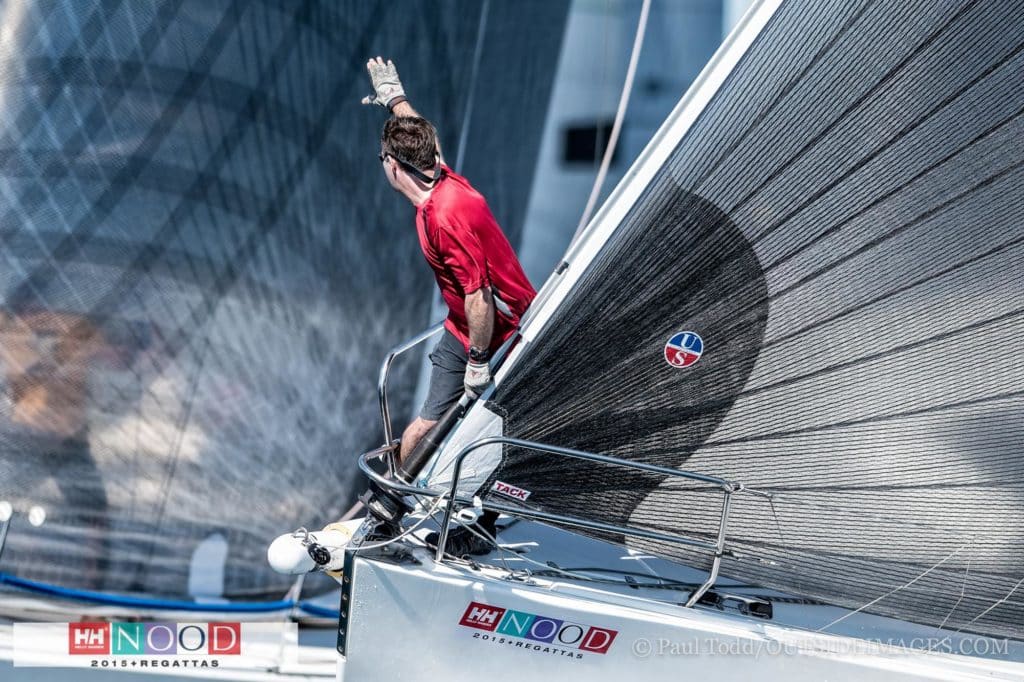 In the final race of the J/70 series at the Helly Hansen NOOD Regatta in San Diego, Bruce Golison’s team on Midlife Crisis won the pin, took the first cross, and sealed the team’s regatta win.
