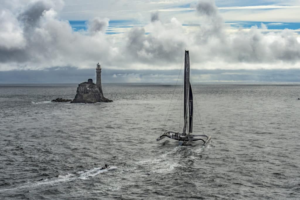 With the multihulls around, the maxis are approaching the Fastnet Rock.